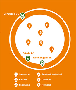 Gut zu wissen: Die Nutzungszone ist so bemessen, dass die Bahnhöfe in Bünde, Lemförde und Kirchlengern ohne Zuzahlung erreicht werden können. Und: Sie müssen nicht schon um Mitternacht zu Hause sein – der Nutzungstag beginnt und endet um 3:00 Uhr morgens.